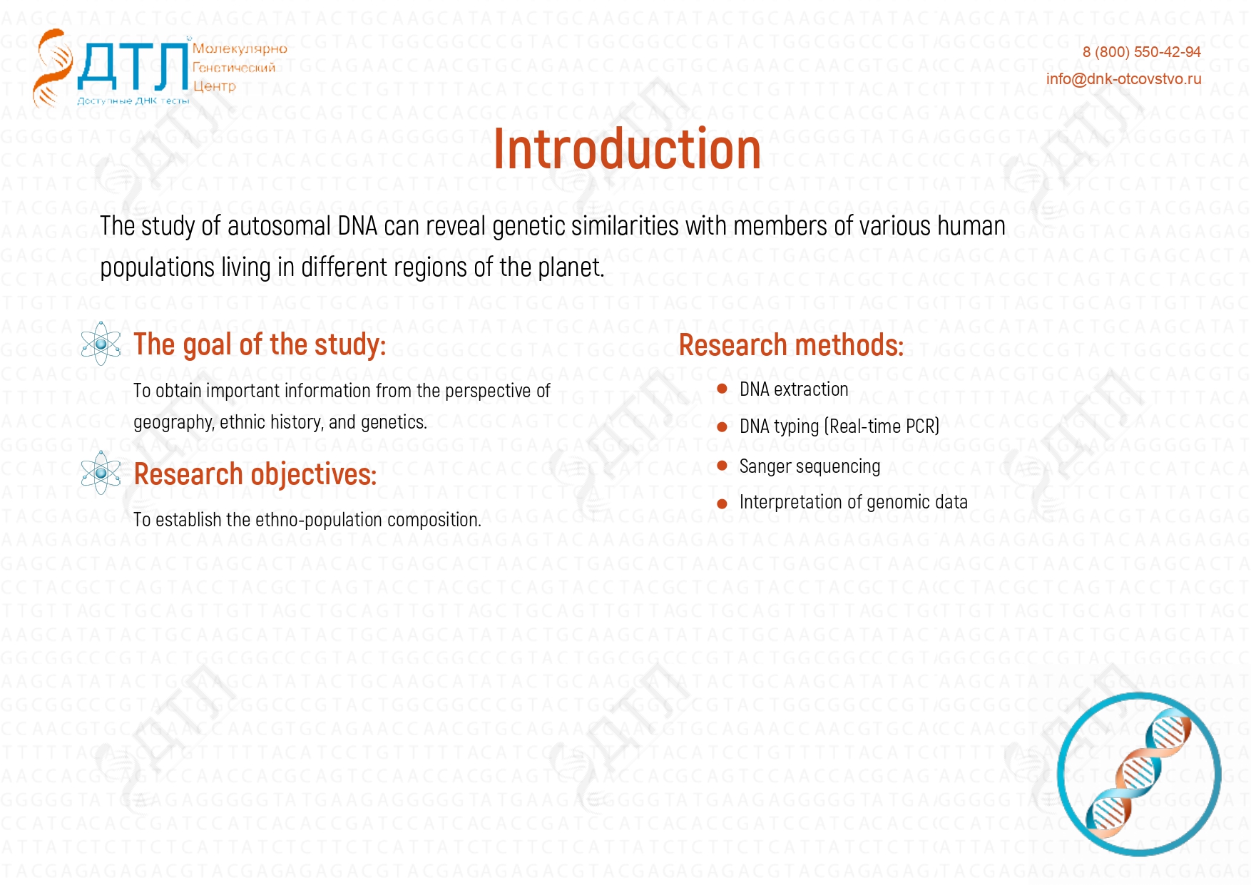 The «DTL» DNA Center conducts DNA testing throughout the entire Russian Federation. The laboratory uses equipment from Applied Biosystems, a global leader in biotechnology. Modern scientific and technological advancements enable us to perform unique DNA tests that are offered by only a few laboratories worldwide. All tests are carried out exclusively by certified specialists, including world-class experts with over 15 years of experience in DNA research.