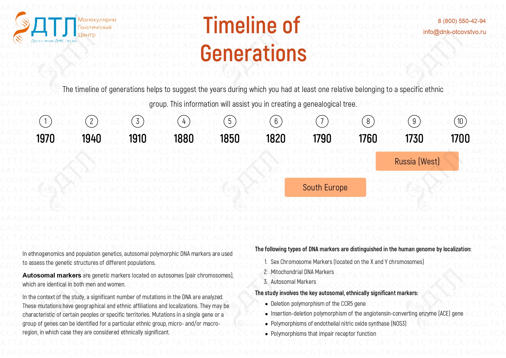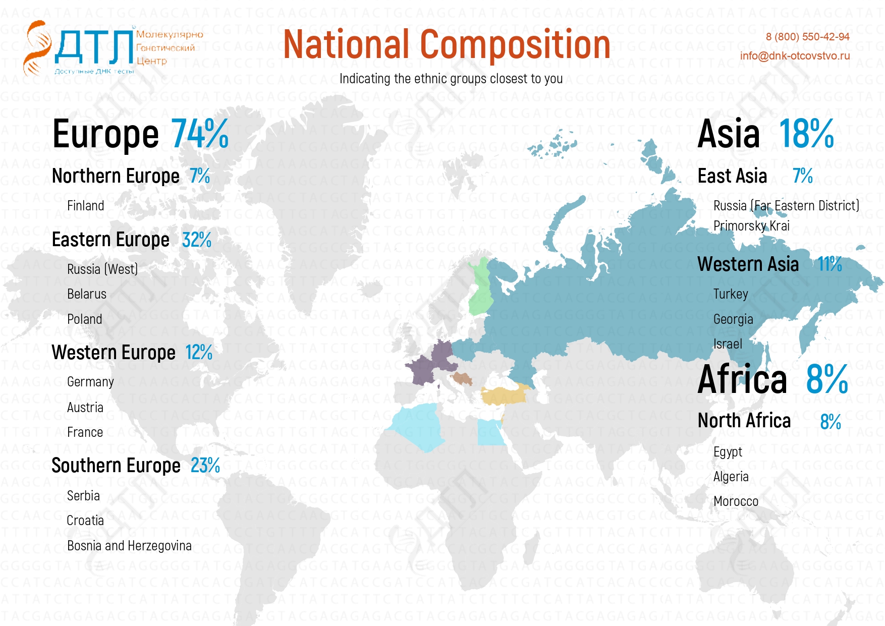 For a more detailed study, we recommend taking a DNA test for ethnic origin through the paternal line (Y-chromosome analysis) and the maternal line (mtDNA analysis).
