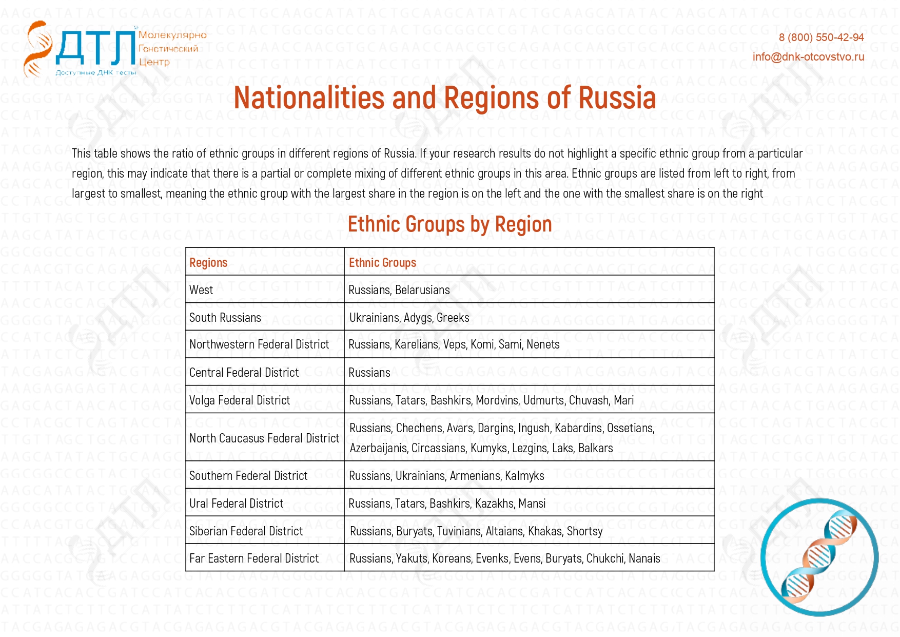 At our center “DTL”, you can take a DNA test for nationality and discover your genealogical roots. Among your ancestors, there may have been Jews, Karelians, Ossetians, Moldovans, Chechens, Belarusians, and many others.