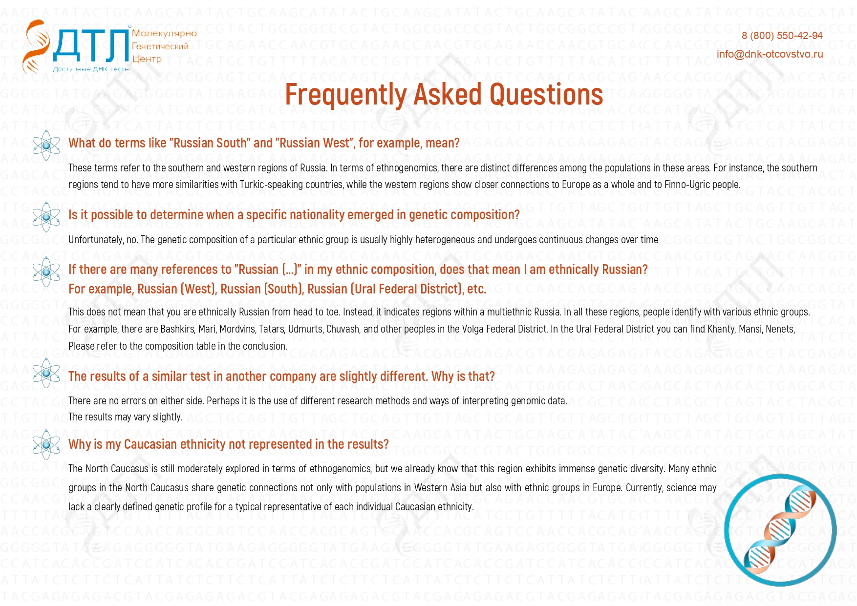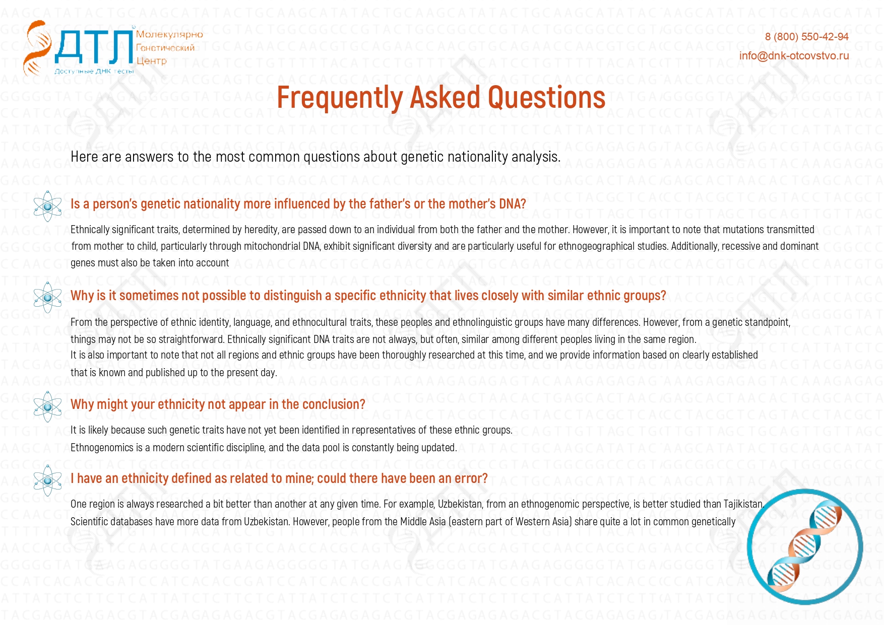 Our specialists will help you understand your specific situation. Get a free consultation and take a DNA test in Moscow by filling out the form on our website or by calling: +7 (499) 490-28-01 day and night.