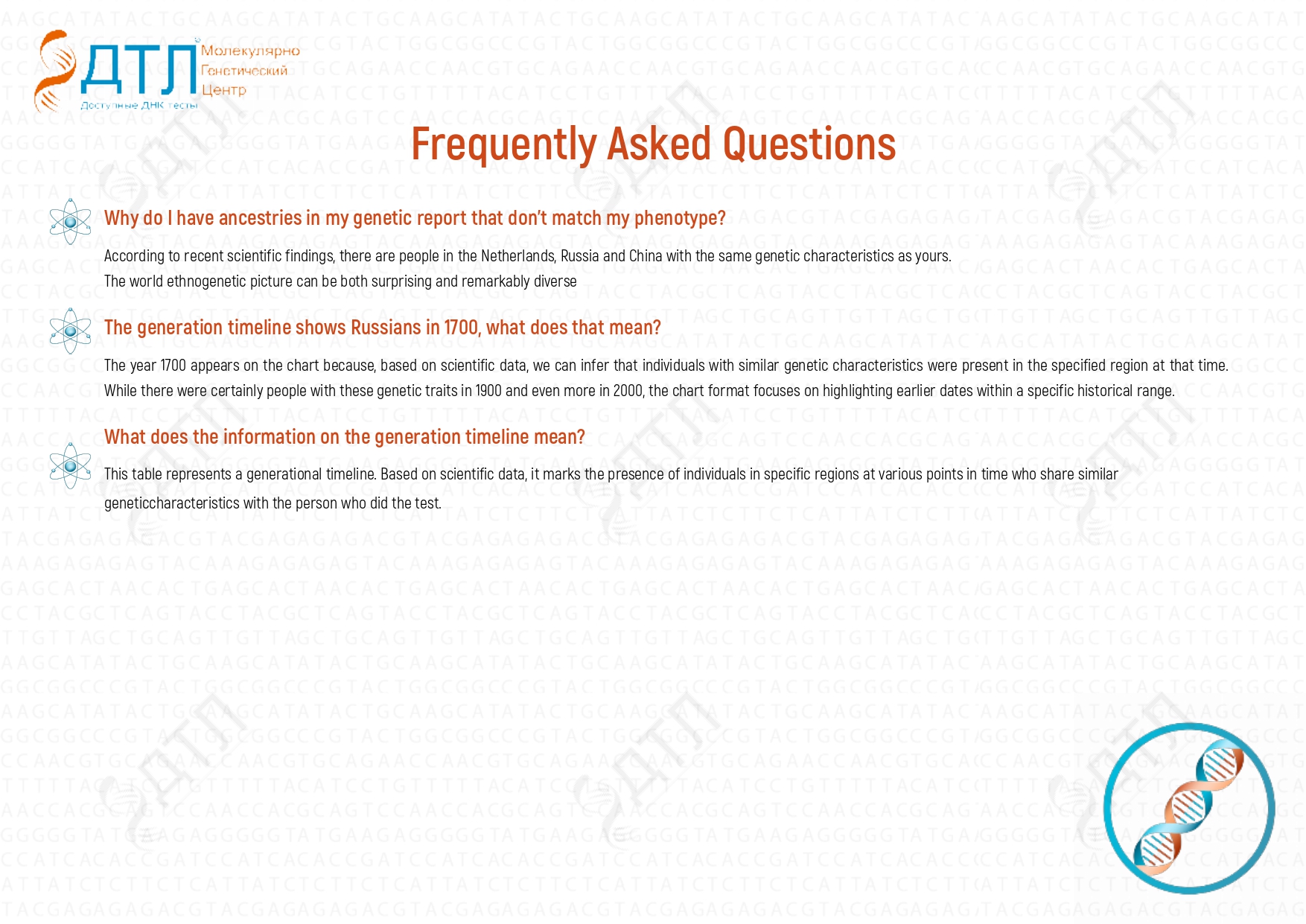 Our laboratory is equipped with the latest technology for conducting DNA genealogy analysis. However, that is not the primary reason why our lab is #1 in Russia for DNA genealogy testing. Our team of international experts, with extensive experience in DNA testing for ancestry, is the driving force behind our success. We conduct our DNA research based on a DNA database containing a large sample collection from around the world, giving us the ability to determine anyone’s ethnic origin through their DNA.
